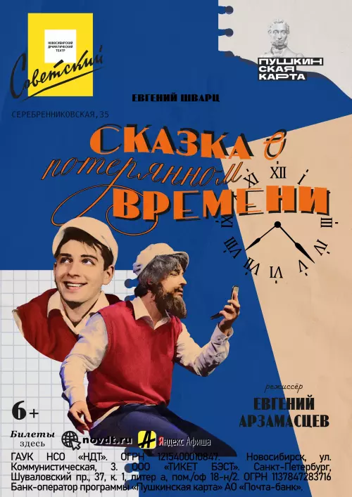«Сказка о потерянном времени» Евгения Шварца знакома каждому с детства, ее любят дети и родители, бабушки и дедушки. История о том, как злые волшебники превратили третьеклассника Петю Зубова и других школьников в стариков, потому что они не ценили время и тратили его впустую. Спектакль подарит зрителю мудрость – о бессмысленно потерянном времени. В спектакле также затронута тема дружеского единства. Красочный и динамичный спектакль Новосибирского драматического театра сделан в ретро-стиле. Удивительные превращения, погоня, волшебство – с легкостью затянут юного зрителя и перенесут в эпоху СССР.
